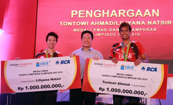 Djarum Foundation kembali memberikan bonus kepada Tontowi Ahmad/Liliyana Natsir. Ganda campuran yang berhasil menyabet emas Olimpiade Rio de Janeiro 2016 siang tadi (1/9) mendapat masing-masing satu rumah senilai Rp 1,5 milyar di Perumahan Graha Padma, Semarang.