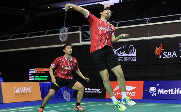 Babak pertama ganda putra kejuaraan bulutangkis Singapore Open Super Series 2015 usai dilaksanakan. Laju ganda putra nomor satu Indonesia, Mohammad Ahsan/Hendra Setiawan masih belum terhadang. Tampil sebagai unggulan keenam, juara Malaysia Open Super Series Premier 2015 ini menghentikan ganda Malaysia Goh V Shem/Tan Wee Kiong. Namun perjalanan Ahsan/Hendra menuju babak kedua kurang berjalan mulus. Ganda Malaysia yang menduduki peringkat 52 ini sempat mencuri game pertama dengan 21-18. Ahsan/Hendra membalas di dua game berikutnya dengan 21-14.