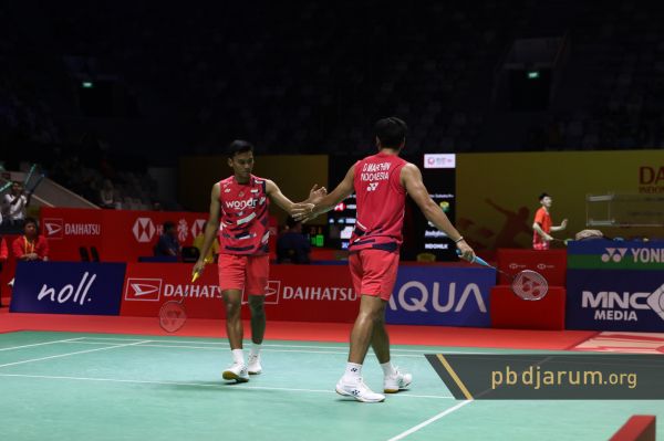 Daniel Marthin/Muhammad Shohibul Fikri, ganda putra Indonesia yang bertanding di babak 16 besar Daihatsu Indonesia Masters 2025 akhirnya harus terhenti. keduanya kalah dari Kang Min Hyuk/Kim Won Ho (Korea) straight game dengan skor 19-21, 19-21.