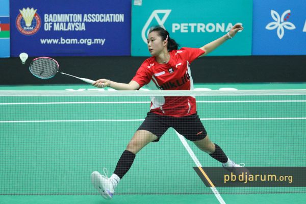 Tunggal putri PB Djarum, Jolin Angelia menghadang laju pemain Malaysia Carine Tee di babak dua Malaysia Junior International Challenge 2025. Kemenangan dipastikan Jolin usai membukukan skor 18-21, 21-15, 21-16.