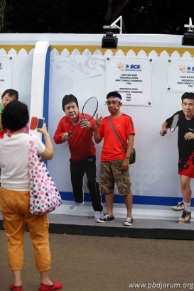 Pengunjung berpose di samping patung juara