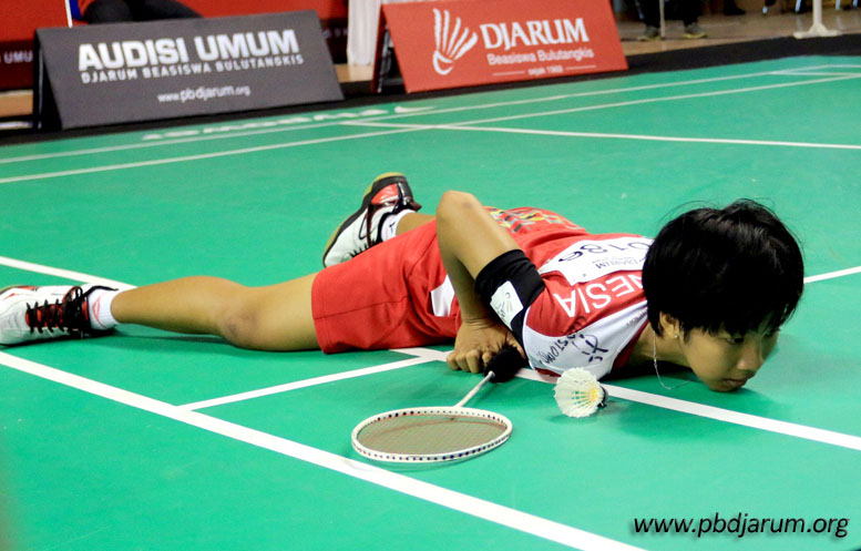 Lufiah terjatuh saat berusaha menjangkau shuttlecock