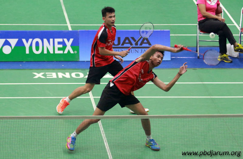 Andika Ramadiansyah/Rinov Rivaldy mencoba memotong laju shuttlecock